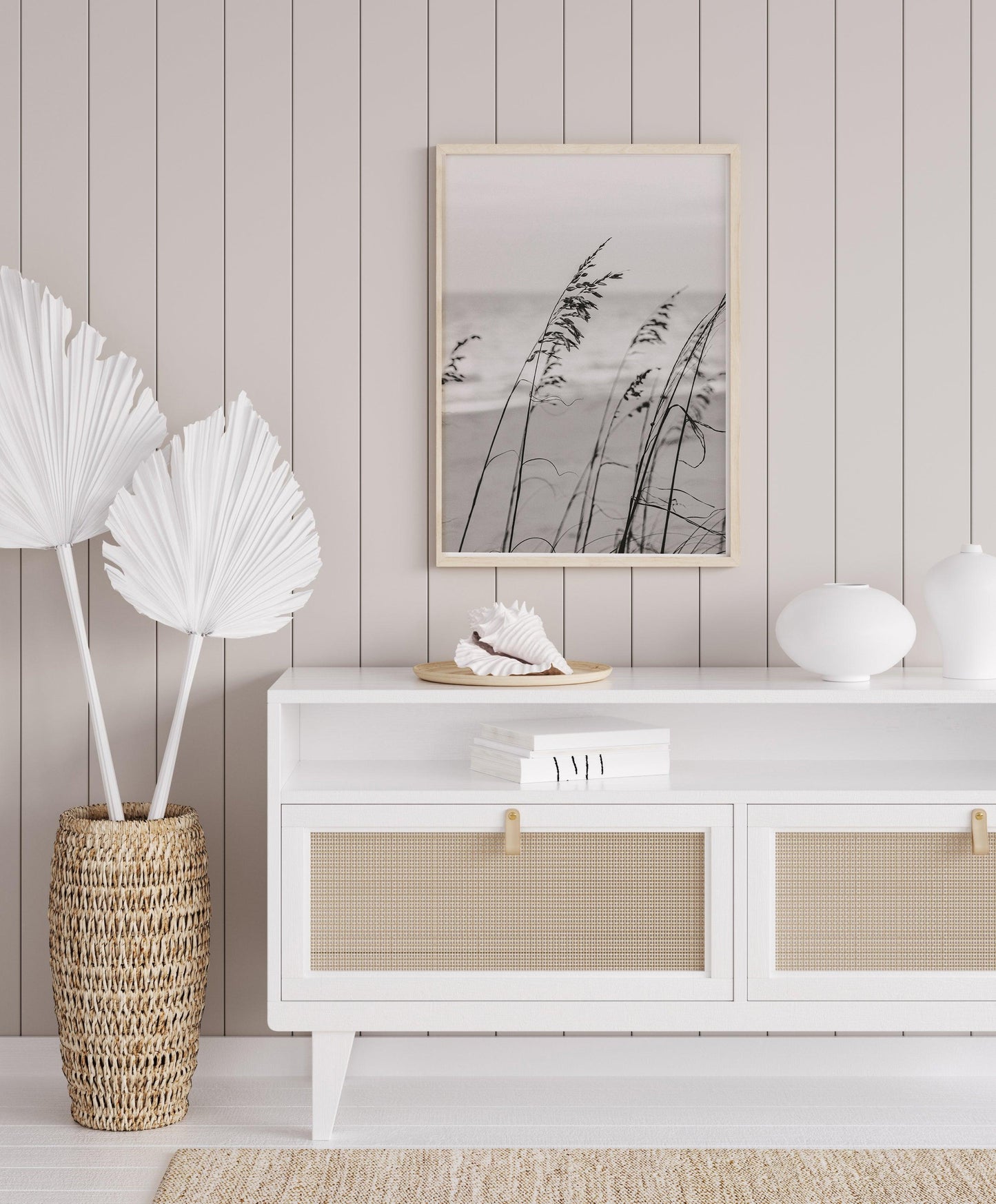 This beautiful beach print is a bestseller and is perfect for any beach house or room with coastal decor with its neutral colors. It’s part of a series of beach photography prints. The beachfront photos included in this collection feature a variety of coastal backgrounds with natural elements such as sea oats, sea foam, seashells, and scenic shorelines.